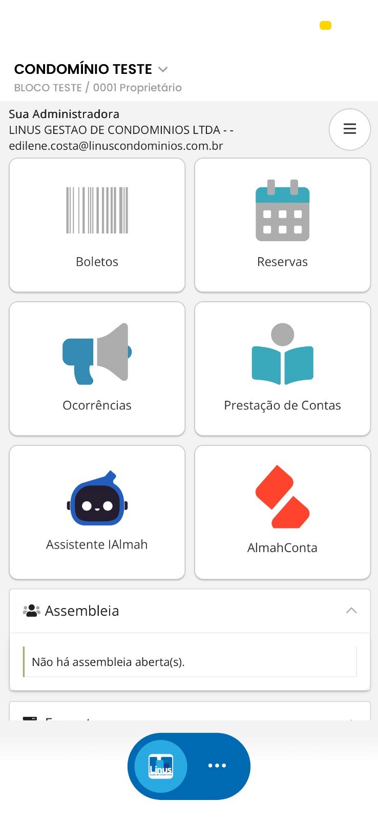 Na tela inicial, reunimos as funções que você mais usa como 2ª via de boletos, reservas e avisos em um layout inteligente, desenhado para você resolver a rotina do condomínio em poucos segundos.